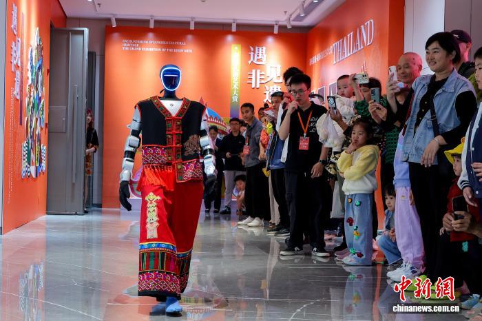 图为身着黎锦衣饰的机械人吸收公众旁观。中新社记者 骆云飞 摄
